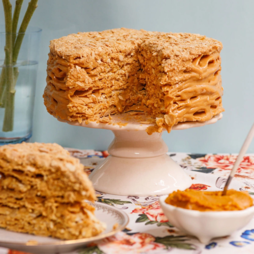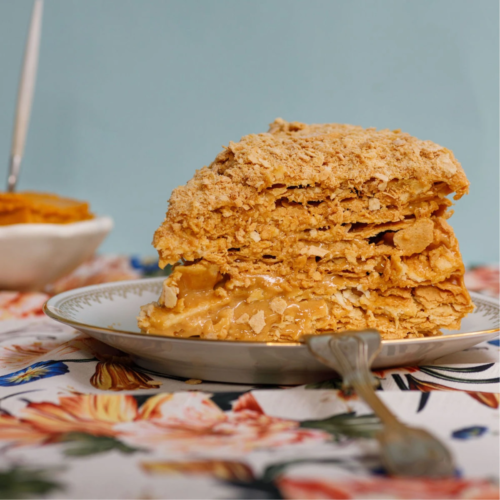 Finas capas de hojarascas con manjar de leche condensada mezclado con lúcuma.