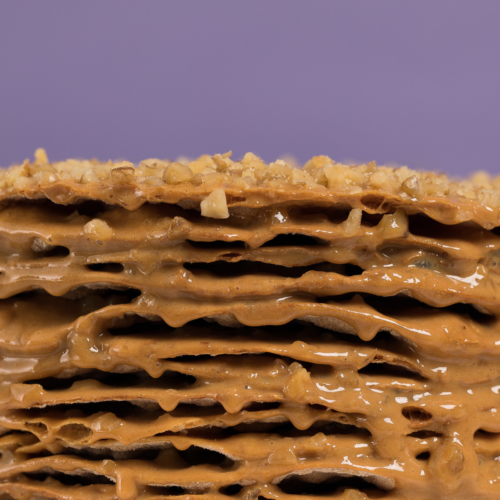 Finas capas de hojarascas con manjar de leche condensada mezclado con trocitos de nuez que le dan ese toque crocante y muy característico.