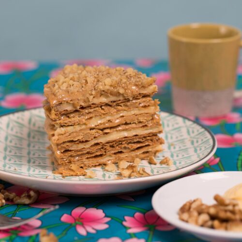 Finas capas de hojarascas con manjar de leche condensada con trozos de nuez y pastelera que combina lo húmedo con lo crocante en cada cucharada.